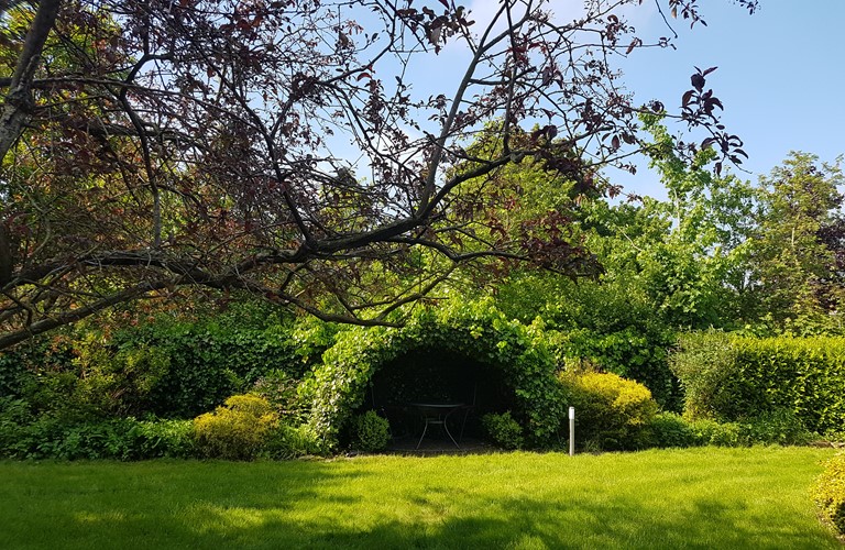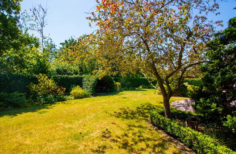 Mooi aangelegde besloten ruime tuin, wel met achterstallig onderhoud.