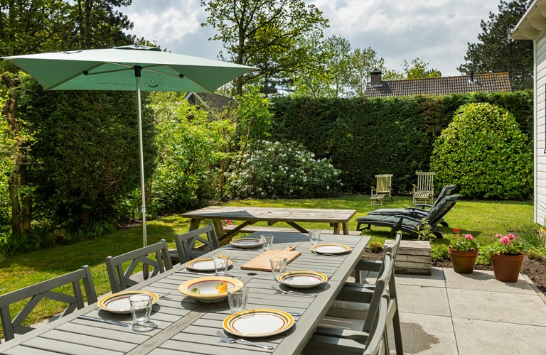 Een ruime tuin om het huis en een terras met een heel mooi tuinameublement.