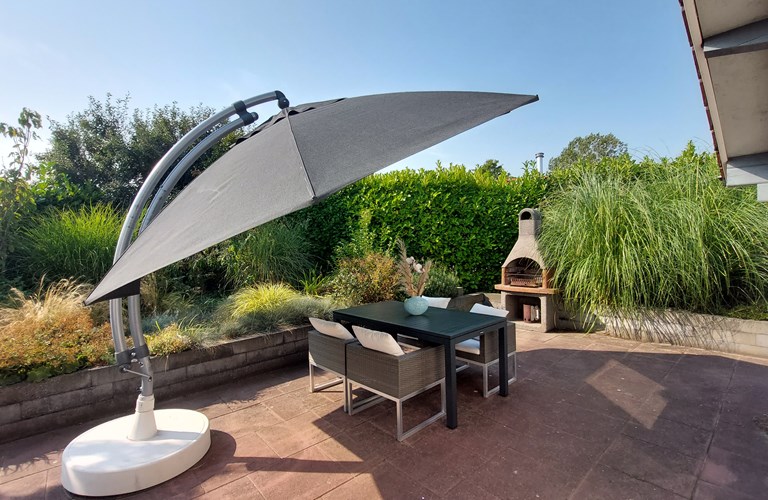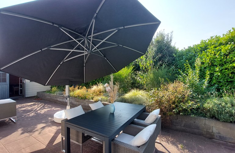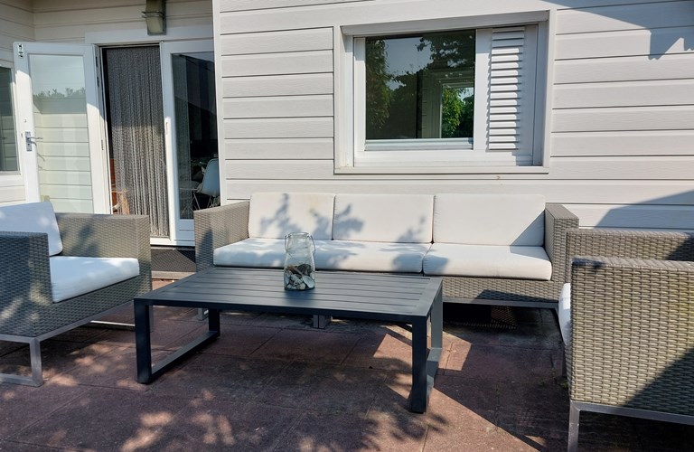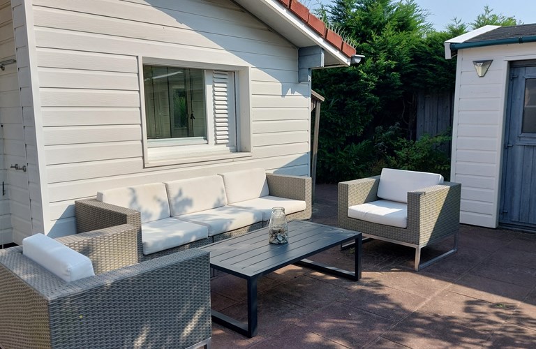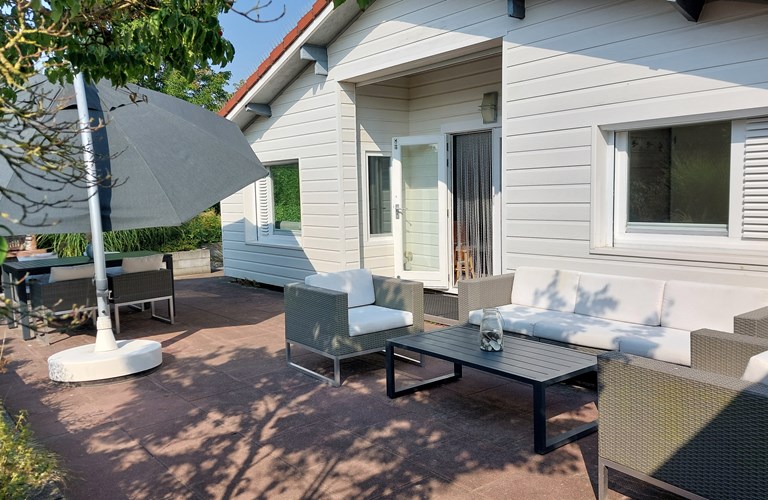 Das Haus ist sehr schön ausgestattet und hat eine wirklich total große Terrasse mit tollen Gartenmöbeln und einem imposanten Sonnenschirm, dazu Stellglaswände gegen zuviel Wind!