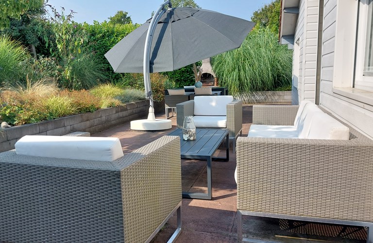 Das Haus hat einen schönen und Kinderfreundlichen Garten und ist komplett umzäunt. Die komfortablen Gartenmöbel und der Pizzaofen sorgen für Gemütlichkeit in den Sommertagen.