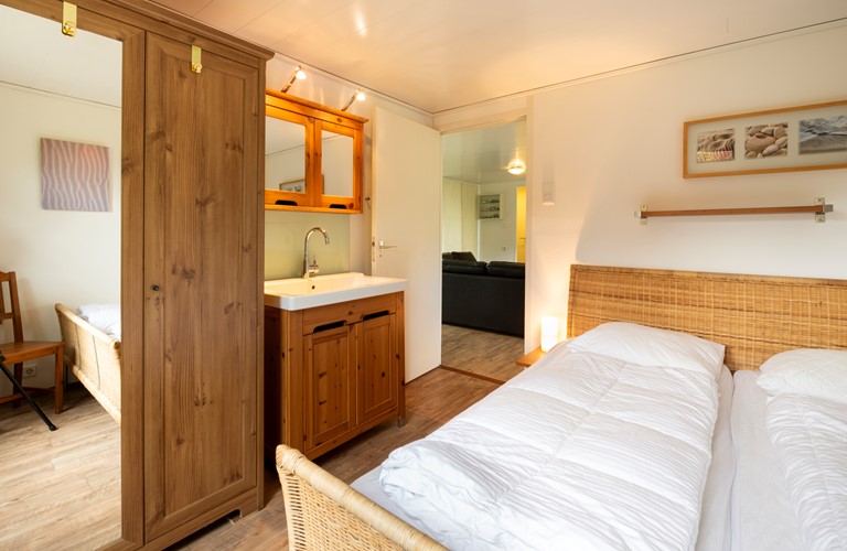 Das Wohnzimmer hat ein schönes, geräumiges Ecksofa, wo Sie den praktischen Smart TV genießen können (funktioniert über Chromecast und Netflix und hat Deutsche Sender). Die Schlafzimmer sind neben dem Wohnzimmer. Eine Schlafzimmer ist für 3 Personen ausgestattet.