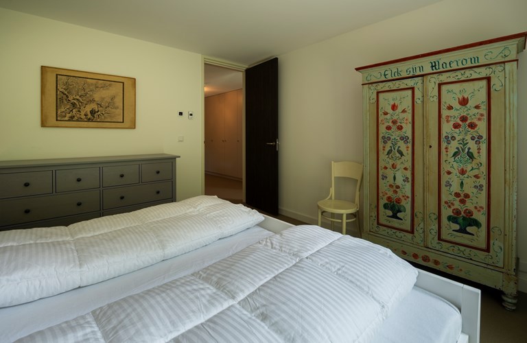 Im Erdgeschoss befinden sich zwei große Schlafzimmer, ein luxuriöses Badezimmer mit Badewanne und ein separates WC. Im ersten Stock gibt es drei weitere Schlafzimmer, davon eins mit einem Einzelbett. Auch hier befindet sich das gleiche luxuriöse Badezimmer wie unten mit allem Drum und Dran. Der erste Stock wird elektrisch beheizt, das Erdgeschoss verfügt über Fußbodenheizung.