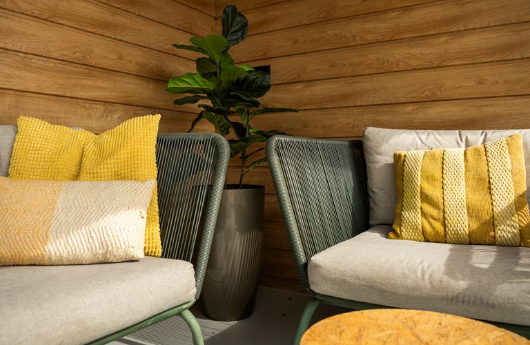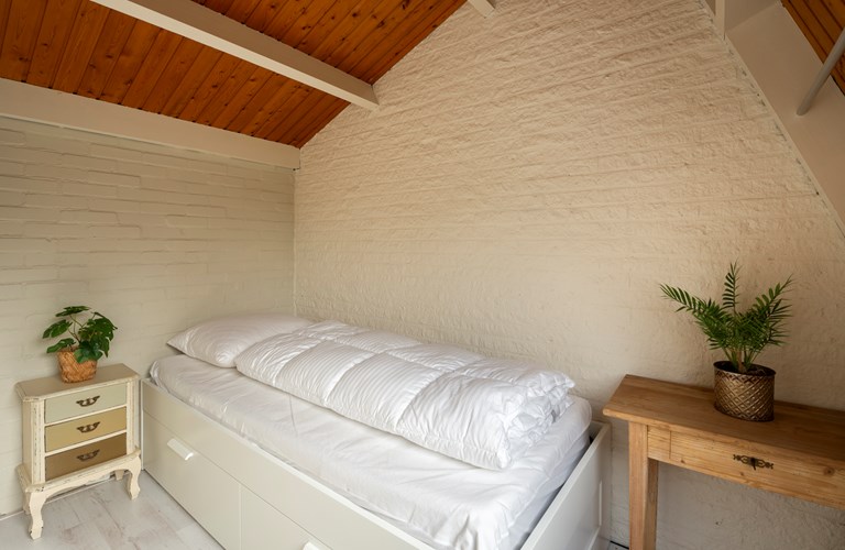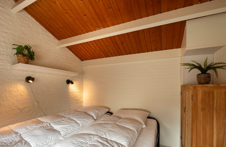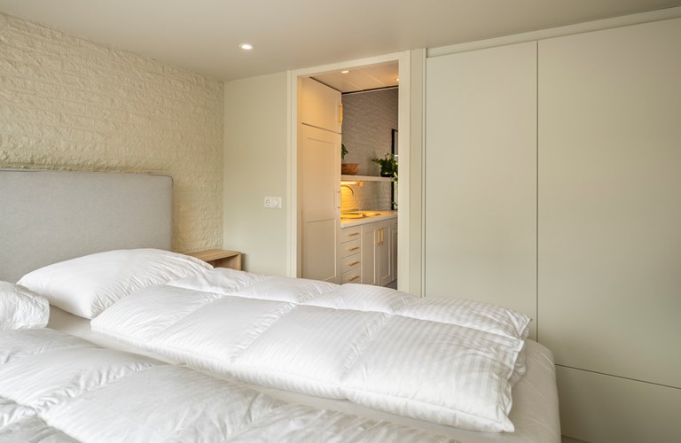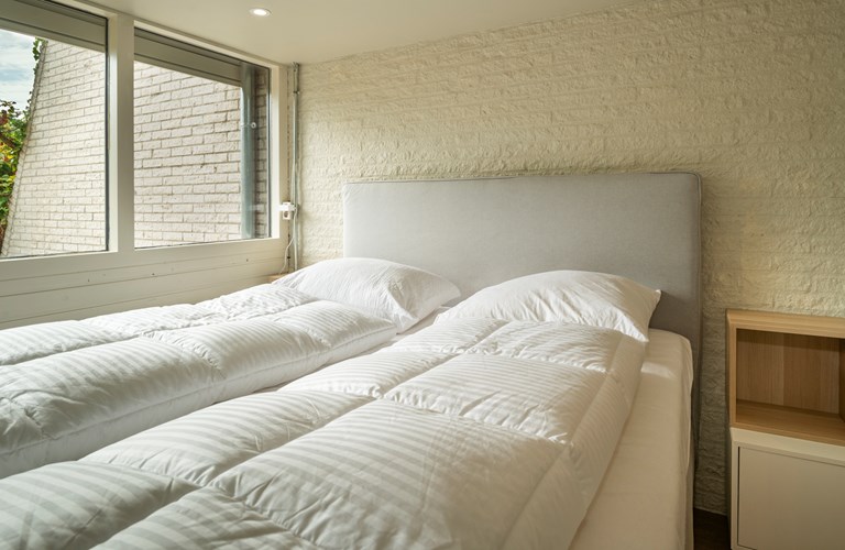 Vom Wohnzimmer aus ist eines der drei Schlafzimmer erreichbar, ausgestattet mit einem Boxspring-Bett und einem Einbauschrank. Die Verdunkelung lässt sich automatisch steuern. Die anderen beiden Schlafzimmer befinden sich im ersten Stock; ein Schlafzimmer mit einem Einzelbett und ein Schlafzimmer mit zwei Einzelbetten.