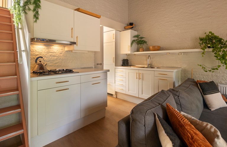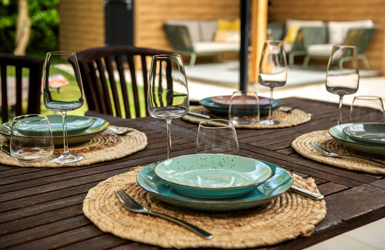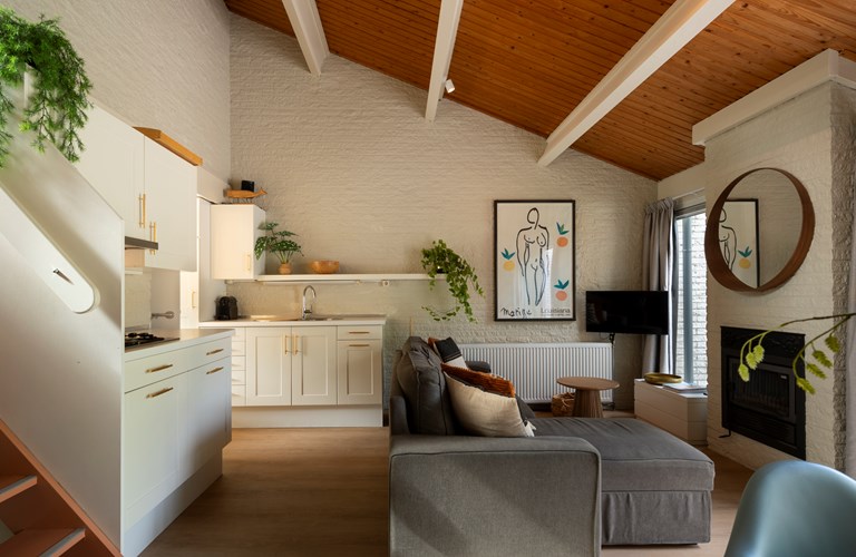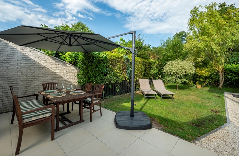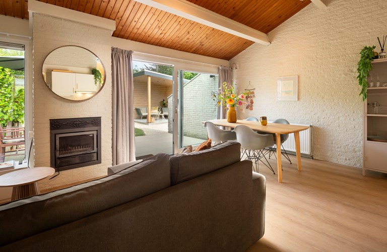 Im Wohnzimmer befinden sich die Küche, eine TV-Ecke mit Kamin und der Esstisch mit 4 Designerstühlen. Es können problemlos noch zwei weitere Stühle hinzugefügt werden. Durch die Schiebetür im Wohnzimmer gelangen Sie auf die Terrasse und in den wunderschönen Garten auf der Rückseite des Hauses. Es gibt eine angenehme Überdachung, unter der Sie tagsüber im Schatten sitzen oder abends die Abendsonne genießen können. Dies verleiht Ihrem Aufenthalt das gewisse Extra!