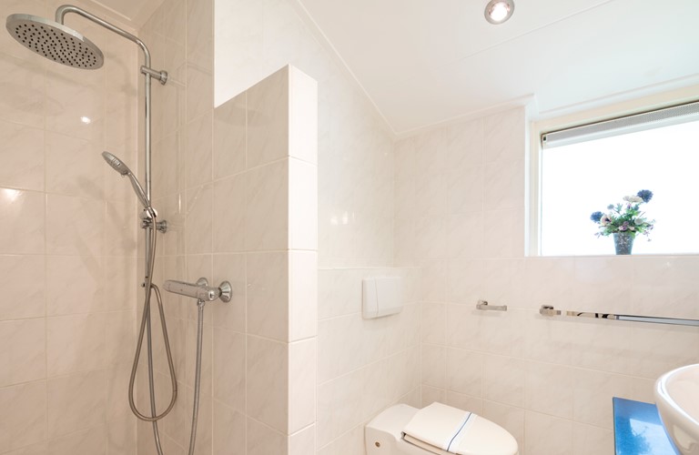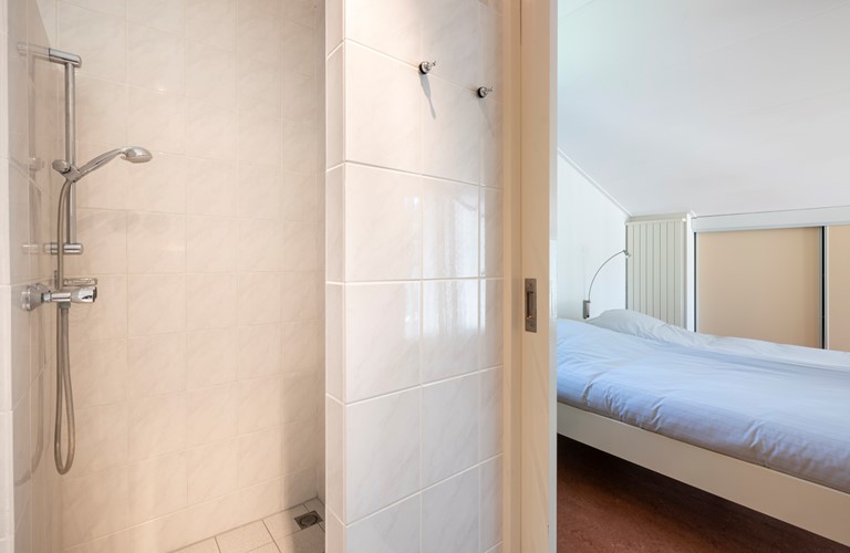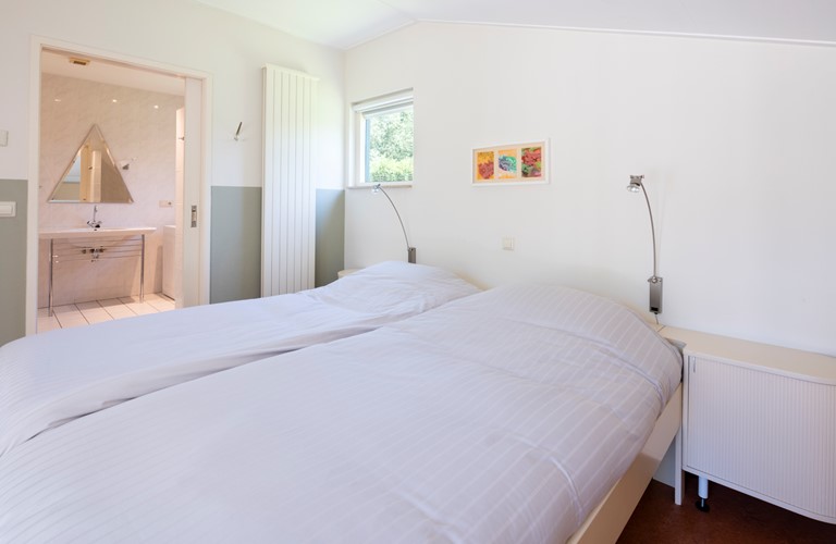 The bungalow has an atmospheric and bright living room with a cosy fireplace, an adjacent open kitchen and a dining area. Both bedrooms have a bathroom en suite. The bathrooms are provided with a shower and toilet and one of the bathrooms has a bathtub as well.