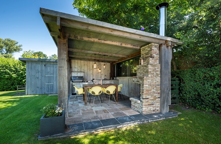 The spacious garden, facing south, has a large terrace where you can perfectly enjoy the outdoor life. Due to the roofed terrace with a fire place and an outdoor kitchen (please note: refilling the gas cylinders is at your own expense), you’ll be able to enjoy the cosy summer nights outdoors. There is a parking at the house, suited for multiple cars and there is a charging station. This house is also equipped with solar panels.