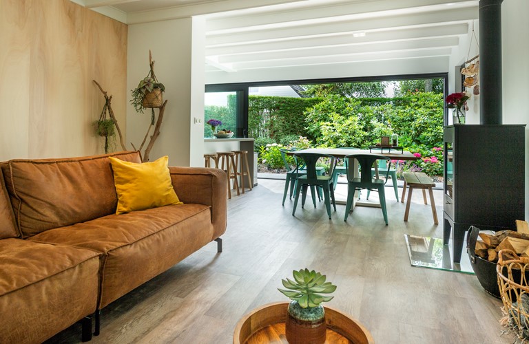 The stylishly decorated living room with an open kitchen is provided with sliding doors connecting the interior and the exterior in a nice way.
