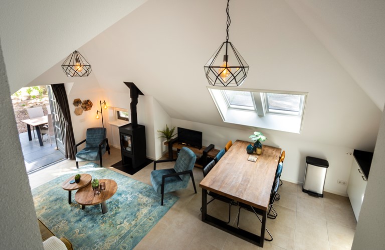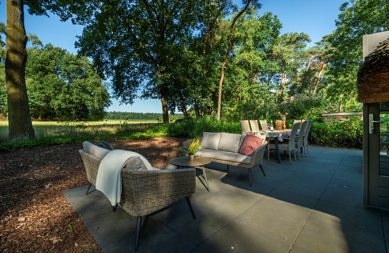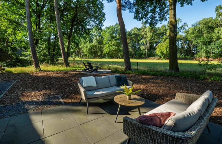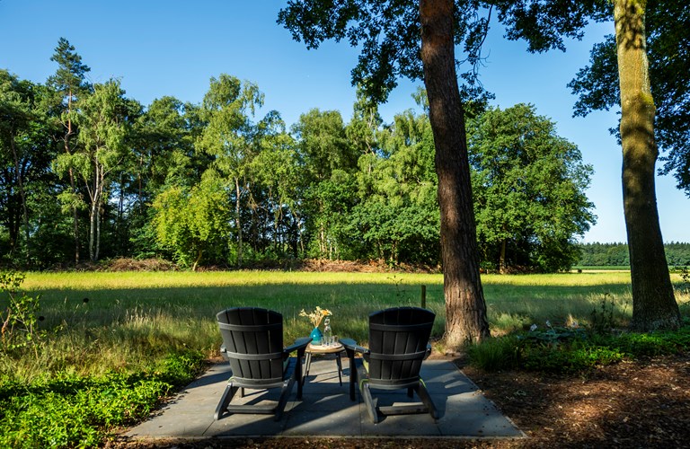 Buiten kunt u heerlijk zitten of dineren met het hele gezin in de lounge of aan de terrastafel en genieten van het buitenleven. Om extra lang van de zon te kunnen genieten is er nog recent een tweede terras aangelegd. Wellicht spot u wat wild zoals een specht, een ree of een eekhoorntje, de acrobaat van het bos.