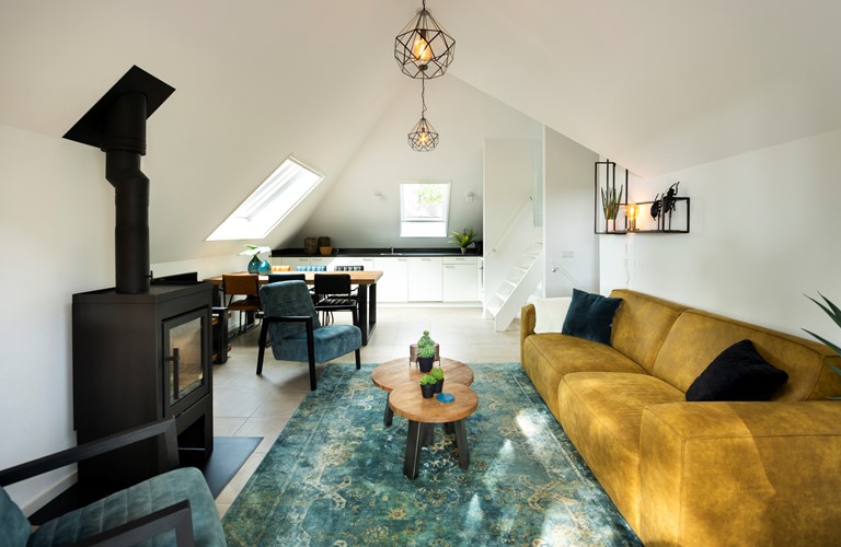 De woning heeft een heerlijk lichte woonkamer met openhaard waardoor ook een verblijf tijdens de koudere dagen hier fijn is. Zowel binnen als buiten is de woning fraai afgewerkt en voorzien van alle comfort en gemakken. De eethoek grenst direct aan de open keuken. Via de openslaande deuren stapt u zo de tuin met terras op. Op de verdieping waar u binnenkomt bevinden zich twee slaapkamers, een badkamer met inloopdouche en een apart toilet. Twee niveaus hoger treft u de grootste slaapkamer van de woning aan. Horren, spelletjes en wat speelgoed voor de kinderen zijn aanwezig.