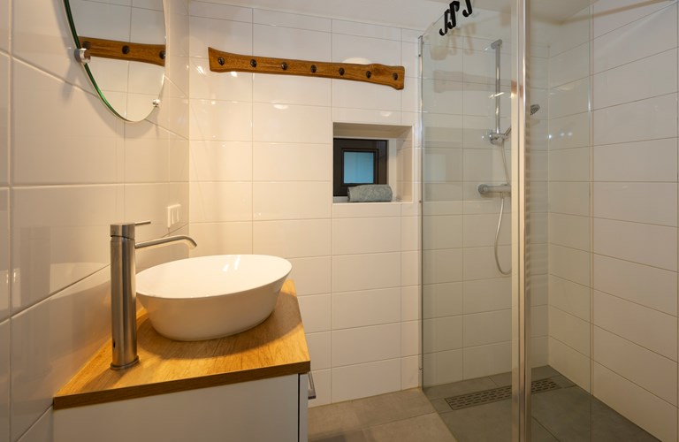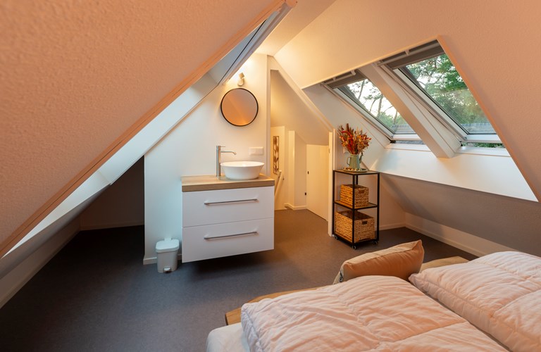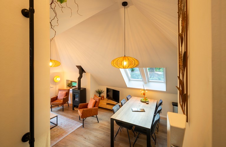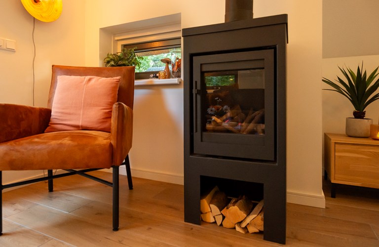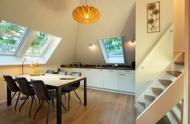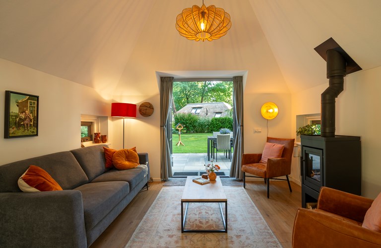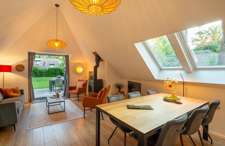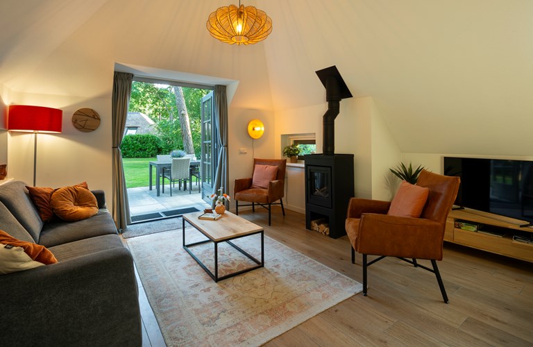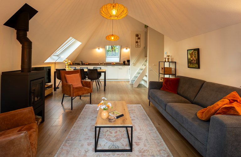 De woning is sfeervol en praktisch ingericht, met zowel oog voor schoonheid als voor comfort. De sfeerkachel is, naast de vloerverwarming, een warmtebron in het huisje. De vlammen verspreiden met één druk op de knop een behaaglijke warmte. De open keuken met het ruime werkblad is van alle gemakken voorzien en nodigt uit tot gezamenlijk kokkerellen.