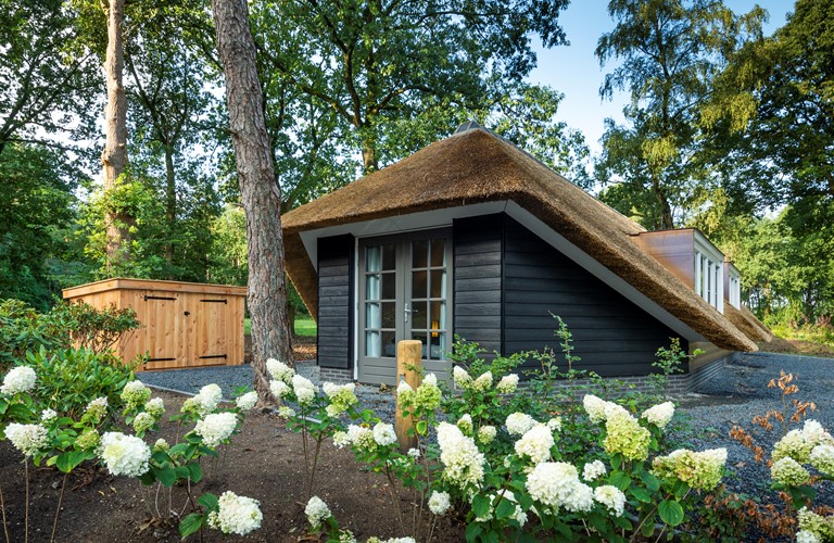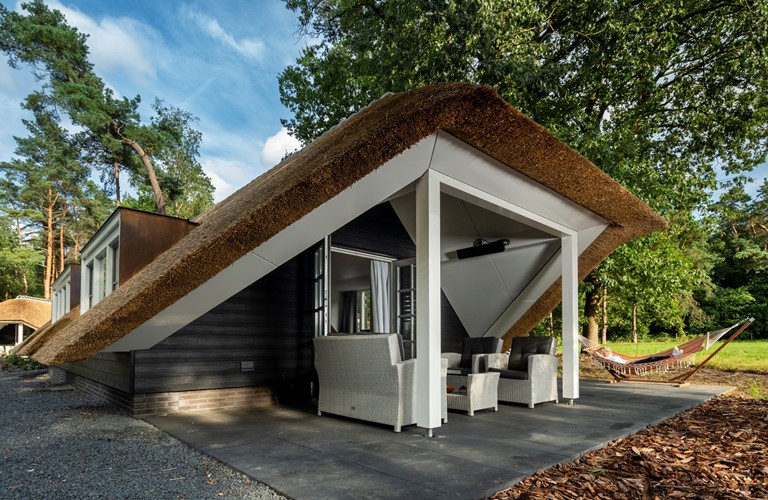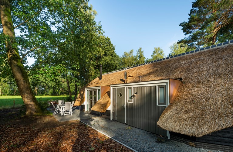 Buiten kunt u onder de kap van het rieten dak (met heater) heerlijk ontspannen of genieten van het uitzicht op de weilanden, bossen en de ondergaande zon vanuit de overdekte zithoek. Aan de zijkant van de woning is tevens een ruim doorlopend terras met tafel en stoelen aanwezig waar u eveneens een vrij uitzicht heeft. Twee parkeerplaatsen en een schuurtje voor eventuele fietsen zijn aanwezig.