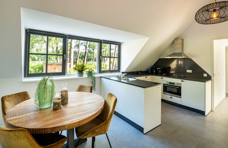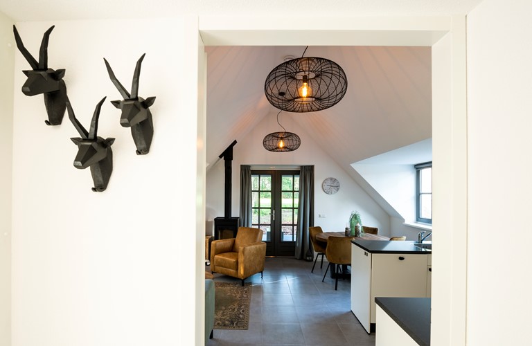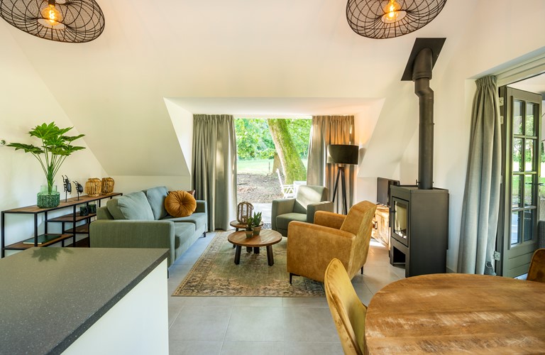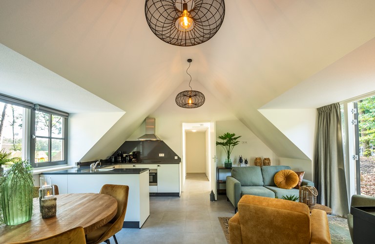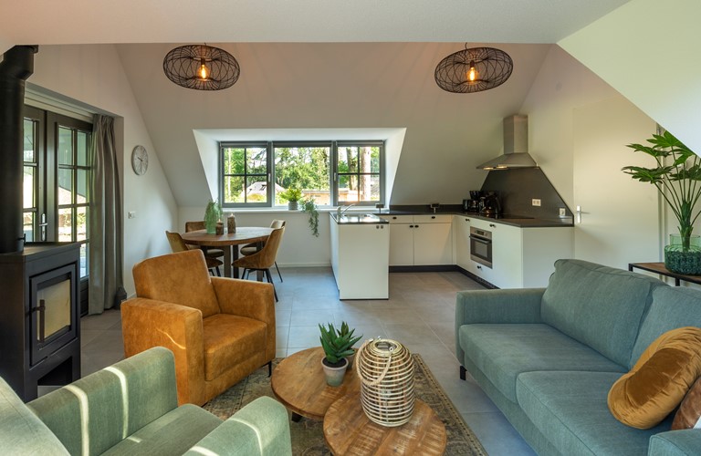 De woning is modern maar knus ingericht, waarbij de sfeer en kleuren van de Veluwe naar binnen zijn gehaald in een stijlvol interieur. Zowel binnen als buiten is de woning fraai afgewerkt en voorzien van alle comfort en gemakken. De woonkamer is voorzien van een heerlijke houtkachel en grenst aan de eethoek en open keuken. In de woning zijn twee tweepersoonsslaapkamers aanwezig en vindt u een mooie badkamer. Het toilet is apart te vinden.