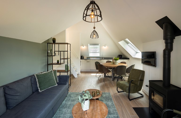 Dit comfortabele huis heeft een stijlvolle inrichting. Er is een ruime ronde eettafel en een gezellige zithoek met 2 fauteuils en een (slaap)bank. De houtkachel brengt warmte en sfeer tijdens de koudere dagen. Via de openslaande deuren stapt u vanuit de woonkamer direct het terras op. De open keuken is van alle gemakken voorzien. Er zijn drie slaapkamers en een badkamer met een ommuurde inloopdouche. De slaapkamer boven beschikt over een eigen wastafel. Hier is tevens een werkplek gecreëerd. In de slaapkamers beneden kunnen de bedden tegen elkaar of los van elkaar geplaatst worden.