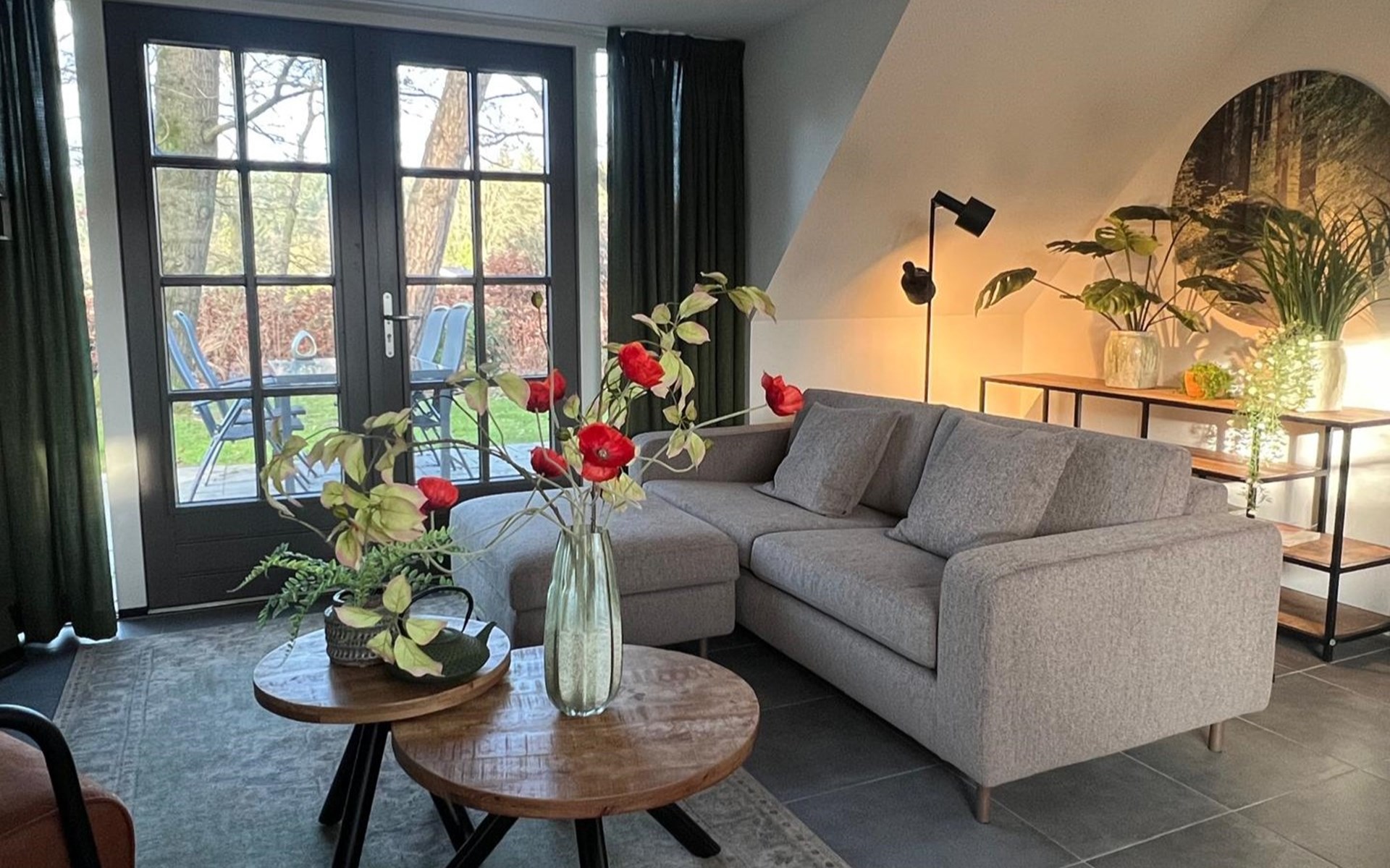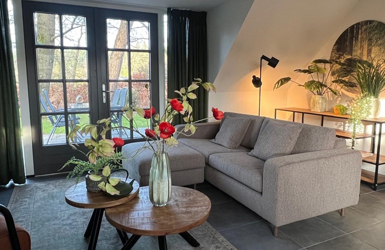De comfortabele woonkamer met hoog plafond geeft aan alle kanten zicht op de heerlijke tuin en het buitenleven vol met twitterende vogels. In de open design keuken met eethoek geniet u van smaakvolle diners. In de koudere maanden zorgt de haardkachel voor gezellige warme avonden. In het zitgedeelte bevindt zich een nieuwe geriefelijke zitbank (december 2025). Via de 2 sets met dubbele openslaande deuren (1 voorzien van hordeuren) stapt u zo vanuit keuken en woonkamer de terrassen op en de tuin in. In deze gelijkvloerse woning bevinden zich tevens 1 ruime master slaapkamer met hoog plafond met dubbele openslaande deuren voorzien van hordeuren. Deze grote slaapkamer heeft een deurketting zodat de deur in de nacht open kan blijven en u 's morgens ontwaakt met de geur van bos en het gefluit van de vogeltjes. U loopt zo het beschutte terras op om te genieten van de ochtendzon. Verder is er een 2e kleinere slaapkamer. Beide slaapkamers hebben 2 bedden (koppelbaar, ‘klikken’ aan elkaar) en zijn voorzien van luxe toppers. De badkamer heeft een inloopdouche en wastafelmeubel en er is een apart toilet.