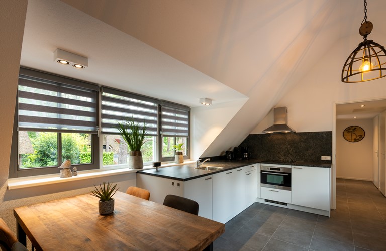 Deze moderne en comfortabele 4-persoons vakantiewoning heeft een gezellige woonkamer en is van alle comfort en gemakken voorzien. In de open keuken met eethoek geniet u van smaakvolle diners. In deze gelijkvloerse woning bevinden zich tevens twee slaapkamers, een badkamer met inloopdouche en een apart toilet. Via de openslaande deuren stapt u zo de tuin met terras op.