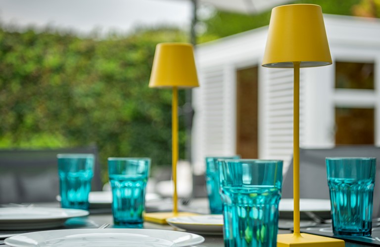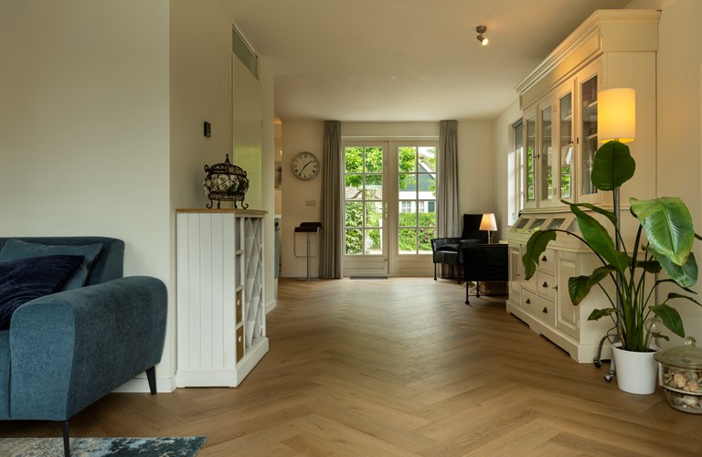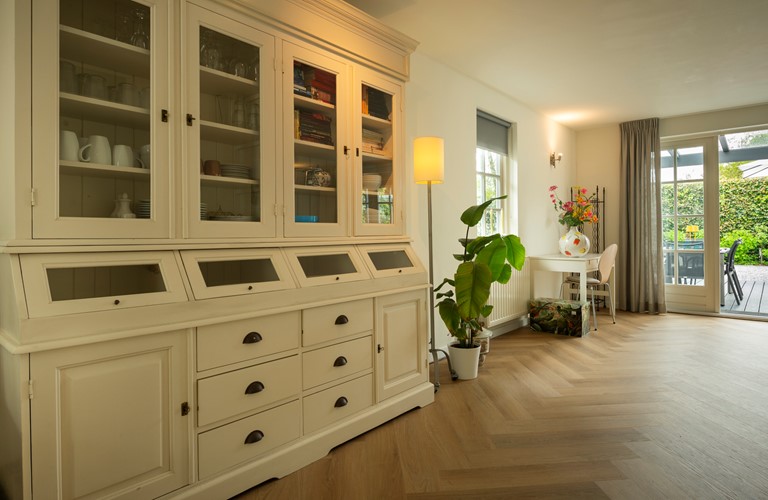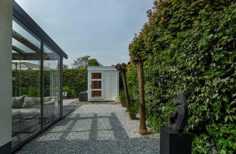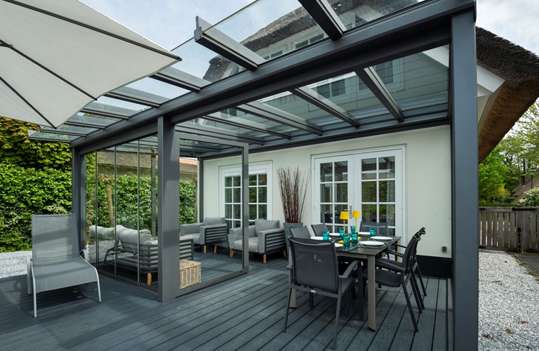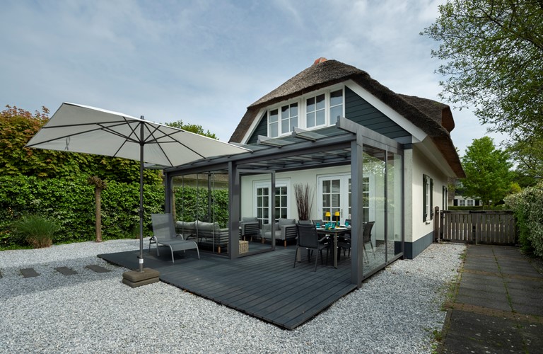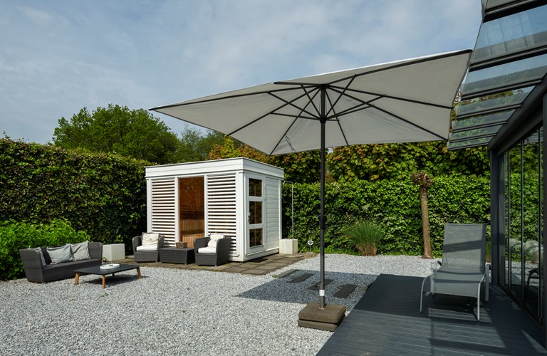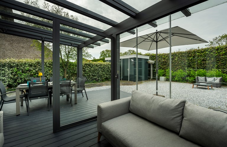 Vanuit de woonkamer stapt u via de openslaande deuren zo het grote, overdekte en uit de wind gelegen zonneterras op. De glazen wanden tussen het terras en de tuin zijn verschuifbaar. Hierdoor lopen tuin en terras in elkaar over. De zijkanten blijven dicht waardoor u heerlijk uit de wind zit. Door de elektrische markiezen kunt u de zonnestralen buiten de woning houden. Sfeerverlichting zorgt in de avonden voor een ontspannend loungegevoel.