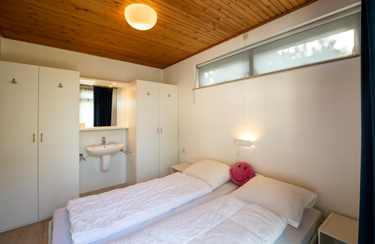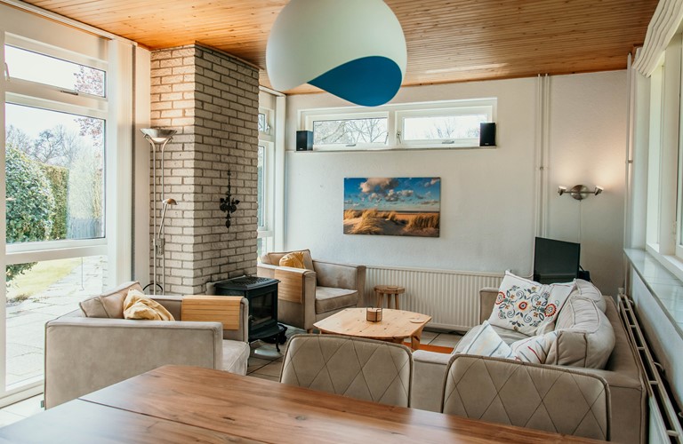 Deze gezellige, gelijkvloerse bungalow heeft een sfeervolle woonkamer met een houtkachel, een aangrenzende eethoek en een open keuken met een vaatwasser. In de woning zijn drie slaapkamers aanwezig, waarvan één met een tweepersoonsbed en een wastafel, met directe toegang tot het terras. Verder zijn er een voorraadkamer, een ruime badkamer met een douche en een apart toilet.