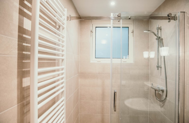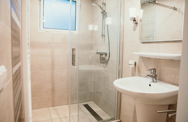 Leider fehlt in der großen Dusche an der Wand ein Haltegriff.