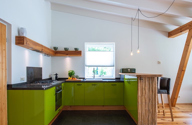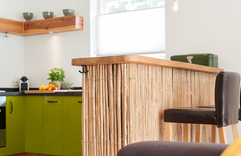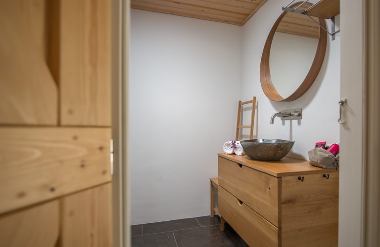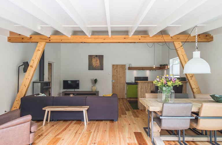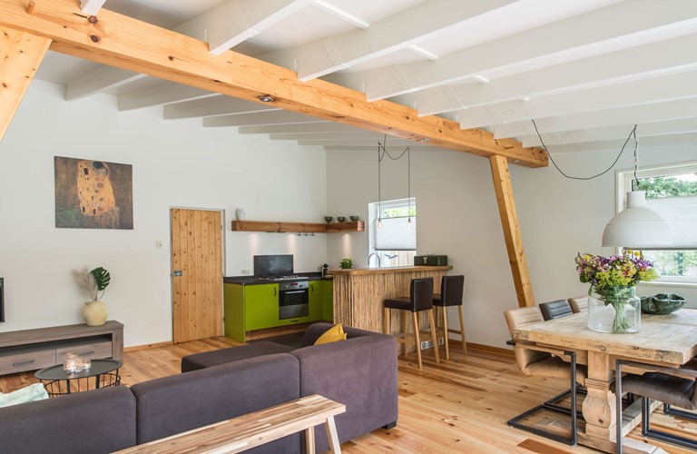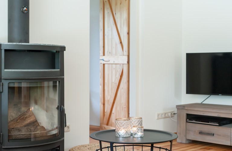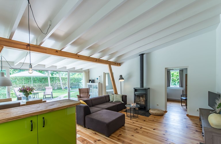De woonkamer is sfeervol en modern ingericht en voorzien van een flatscreen tv (digitaal), DVD speler en een gezellige houtkachel. Weer of geen weer, hier kunt u altijd in sfeer genieten van uw vakantie. Er is een ruime eethoek voor 6 personen en met de royale schuifpui kunt u binnen en buiten optimaal met elkaar verbinden. De moderne, open keuken met bar is voorzien van moderne inbouwapparatuur waaronder o.a. een vaatwasser, een 5-pits gasfornuis, een koelkast en een oven. Voor koffieliefhebbers is er een Nespresso machine.