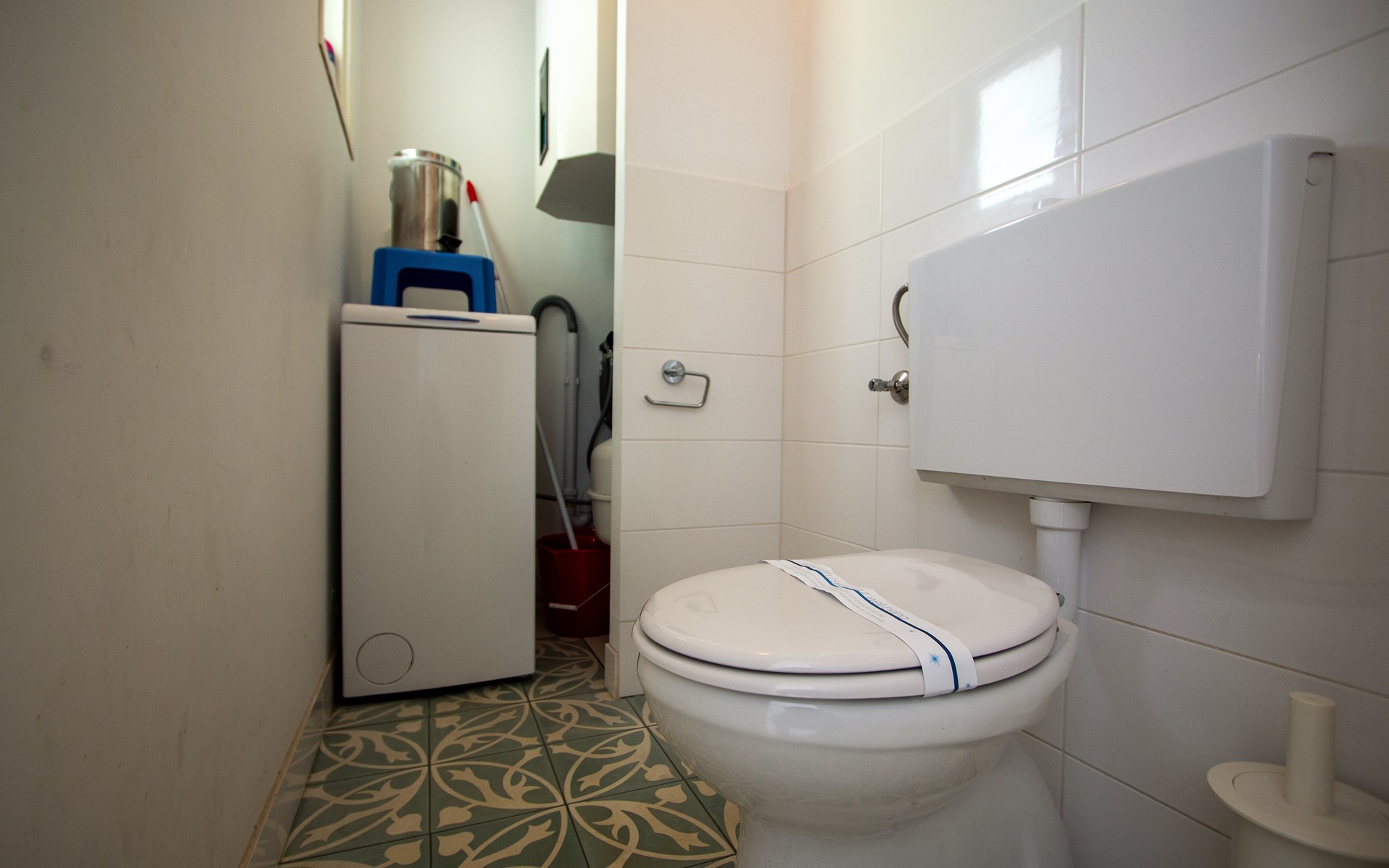 Schönes Badezimmer mit ebenerdiger Dusche, das separate WC befindet sich im gleichen Raum wie die Heizung und die Waschmaschine.