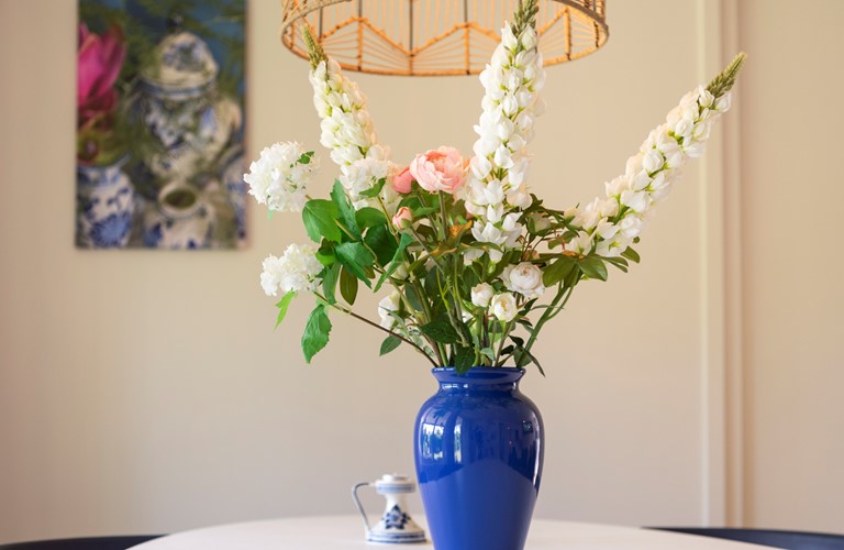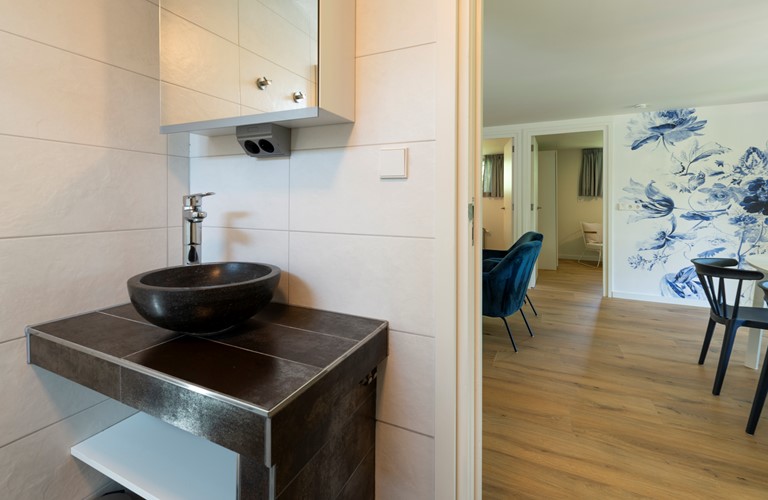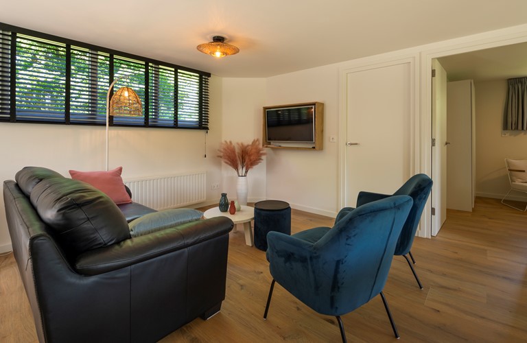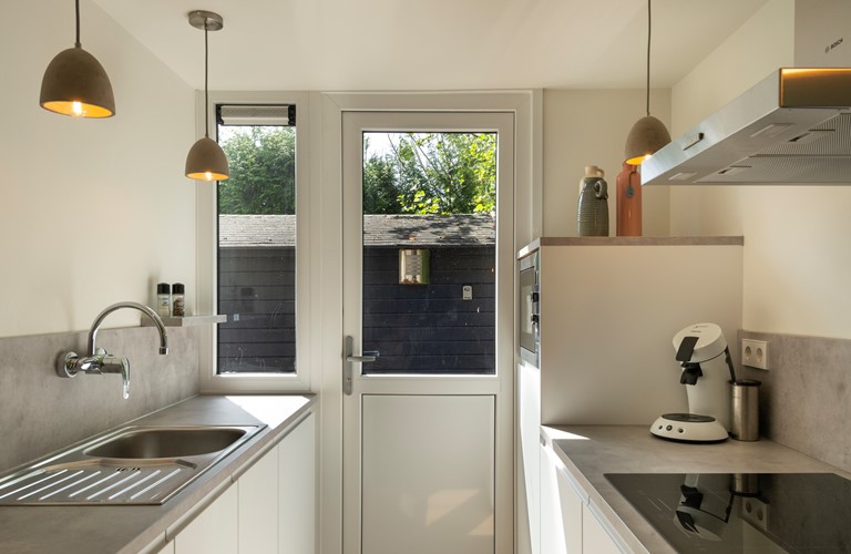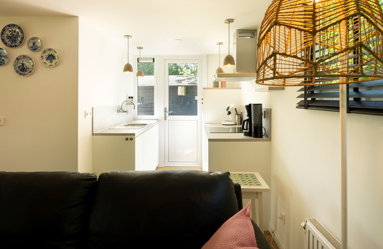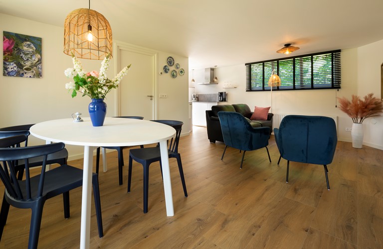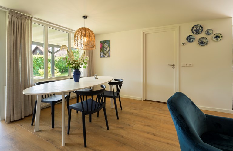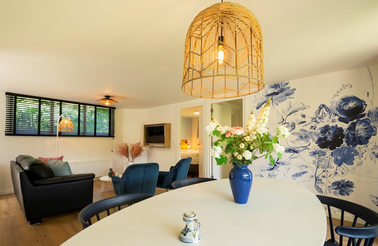 Het vakantiehuis is begin 2022 volledig gerenoveerd en biedt een mooie keuken met moderne apparatuur. De woonkamer is gezellig ingericht en gestyled met typisch Delfsblauwe accenten. De openslaande deuren bieden mogelijkheid om direct vanuit de woonkamer het terras en de tuin in te lopen. In de woning zijn twee slaapkamers aanwezig, allebei ook weer voorzien van sfeervolle blauwtinten. Het plaatsen van een babybedje is mogelijk.