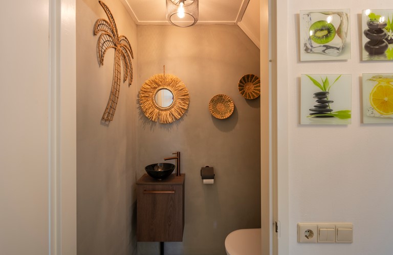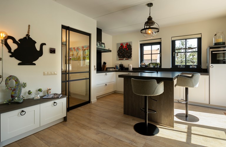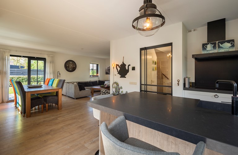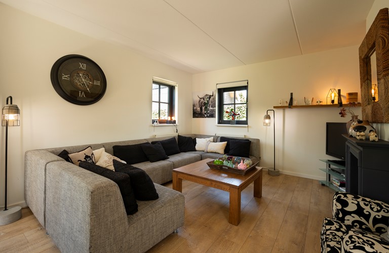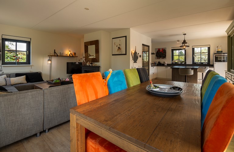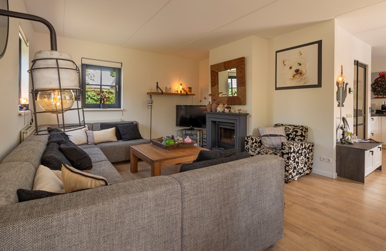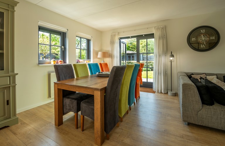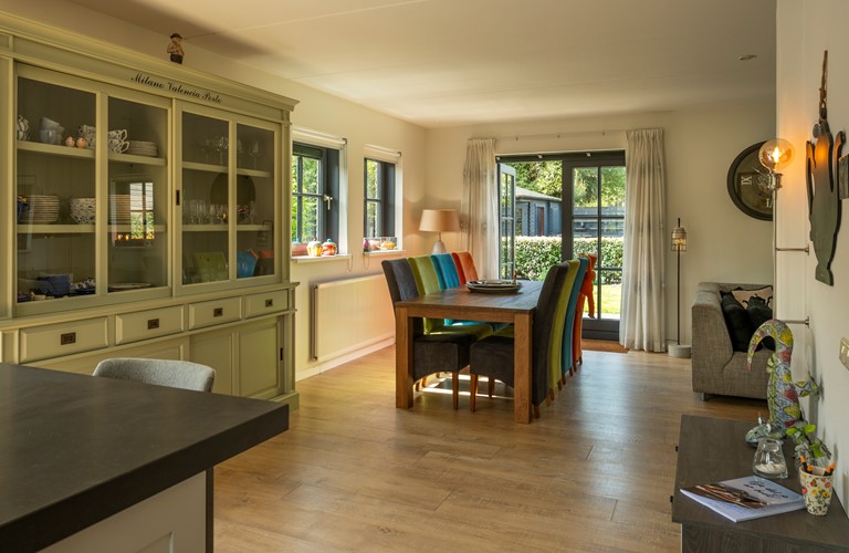 De inrichting is gezellig en comfortabel en de woning is van alle gemakken voorzien. Vanuit de royale zit- en eetkamer heeft u toegang tot het terras en de tuin. De openslaande deuren zorgen ervoor dat u tijdens de warme zomerdagen koelte in huis kunt brengen en in frissere tijden gebruikt u de sfeervolle haard. De aangrenzende eethoek biedt plaats voor het hele gezelschap. In de open keuken kookt u de lekkerste maaltijden op de 5-pits inductieplaat, terwijl u intussen een praatje maakt met uw reisgenoten die aan de keukenbar zitten. Ook de keuken heeft openslaande deuren welke toegang geven tot het terras met de overkapping.