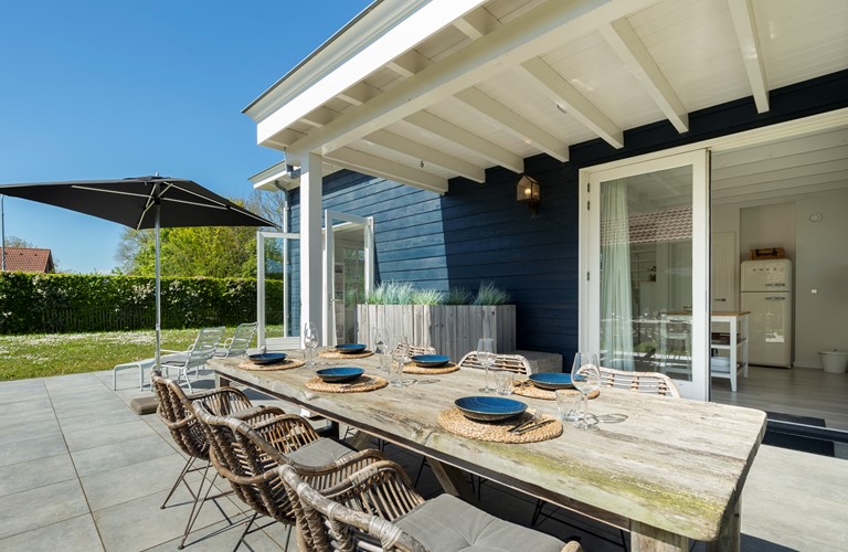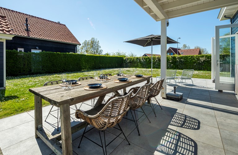 Vanuit de woonkamer stapt u door de openslaande deuren zo het fijne terras op. Dit verbindt het binnen- en buitenleven op een leuke manier. Hier kunt u gezellig samen eten of genieten van de zon op de ligbedden terwijl de kinderen in de volledig omheinde tuin spelen. Doordat het terras overdekt is, is het zelfs bij minder weer heerlijk om buiten te zitten. Er is parkeergelegenheid en een oplaadpunt bij de woning aanwezig.