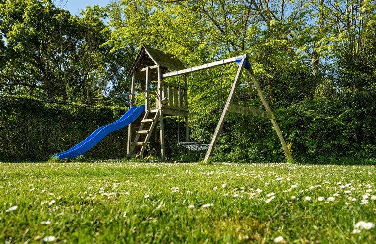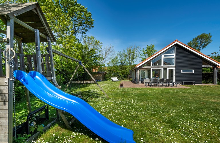De zeer ruime tuin, gericht op het zuidwesten, is een waar genot voor iedereen. Er is een groot grasveld en een overdekt terras, waar u heerlijk kunt genieten van uw boek of een goed glas wijn. Het huis beschikt over een professionele Salta trampoline (4.77x2.44m).