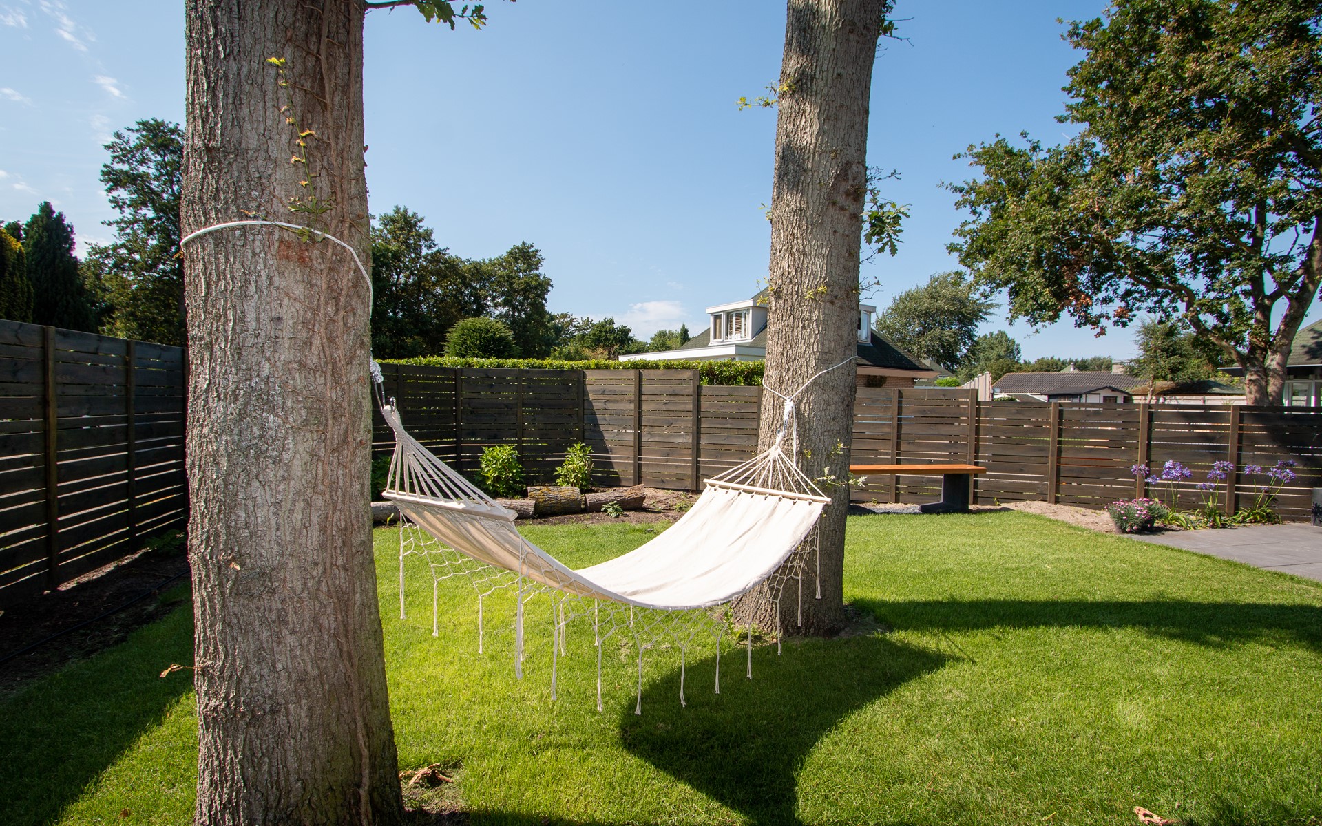 De tuin is geheel rondom de woning aangelegd zodat er bij mooi weer de hele dag zon is. Aan de voorzijde is een grasveldje waar de kinderen en de hond heerlijk kunnen spelen. Ook is er de mogelijkheid om te relaxen op een van de twee terrassen.