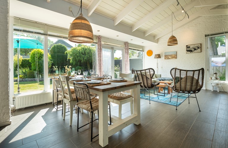 U komt binnen in een praktische bijkeuken, voorzien van extra koelkast. Loop door naar de lichte woonkamer met open keuken, welke van alle gemakken is voorzien, en neem plaats aan de grote eettafel. Er zijn drie slaapkamers, elk voorzien van comfortabele bedden. De badkamer heeft een inloopdouche met regendouchekop. Op de gang vindt u een apart toilet. Geniet van de zon in de veranda of eet lekker buiten aan de tuintafel. Voor watersporters en hondeneigenaren is er een handige buitenkraan aanwezig! Parkeergelegenheid is bij de woning en op het park.